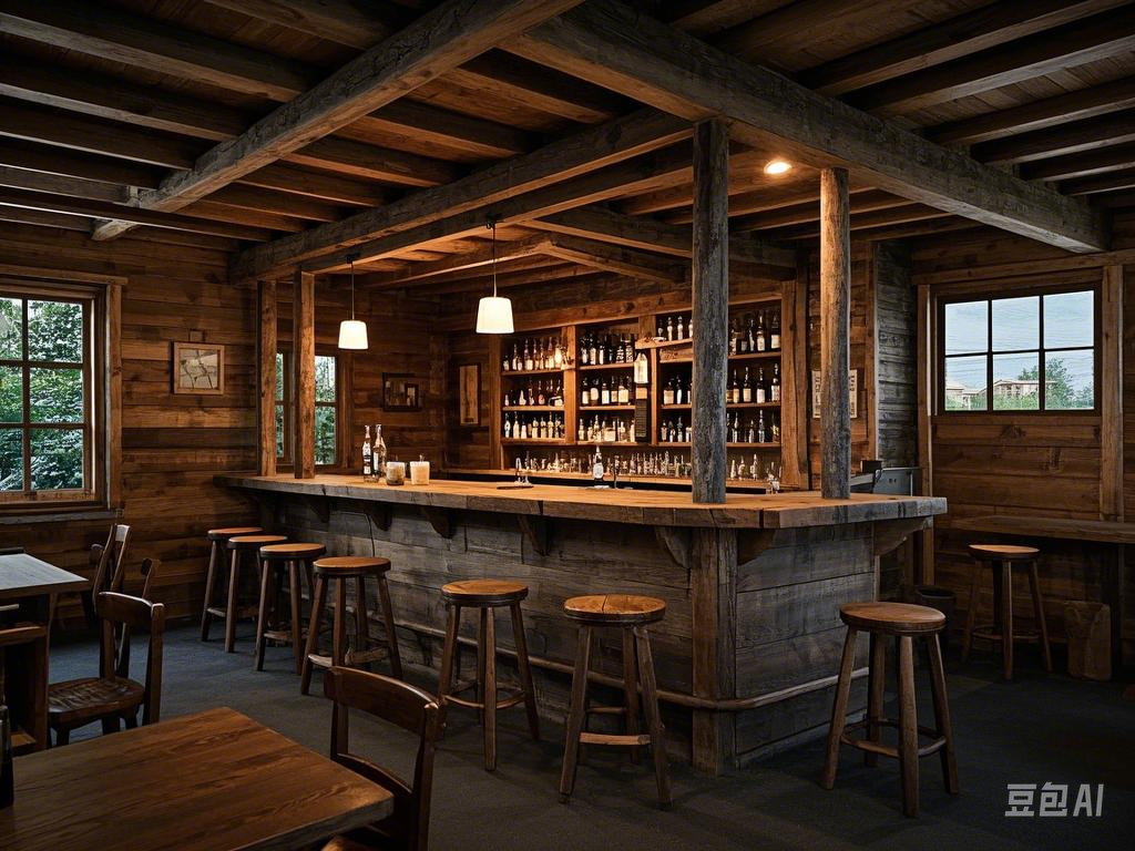 顯而易見,我們需要選擇的是原滋原味的木頭。***好就是把酒吧建在小木屋里,再裝修上木質的吧臺、酒柜、桌椅板凳就好。***好是未經修飾的,粗獷的、野蠻的實木,太過精細的打磨雕飾會減弱鄉村效果。