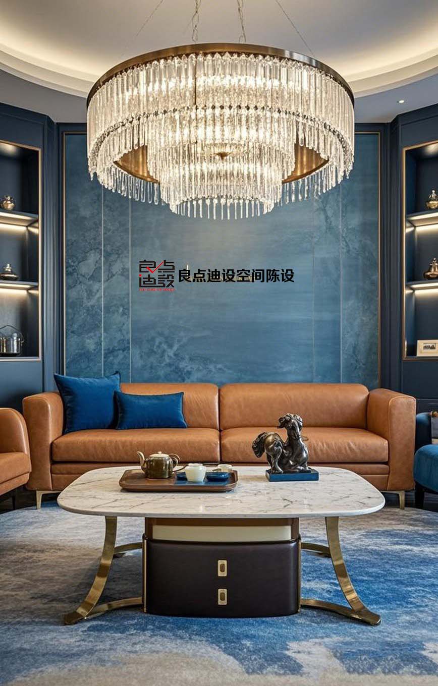 3. 茶色軟裝家具搭配藍(lán)色墻面:藍(lán)色是一種冷色調(diào),和茶色的溫暖形成了鮮明的對(duì)比,能夠營造出一種清新自然的氛圍。