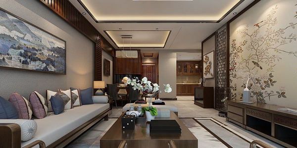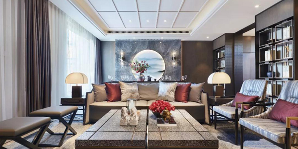 本案里面的中式設(shè)計(jì)元素比比皆是,山水畫、書法名作、瓷器、茶桌等等,這些裝飾品為這個(gè)現(xiàn)代化的空間增添了一抹古韻和別樣的趣味。現(xiàn)代中式的家具,如沙發(fā)、以及工藝品等為新中式疊拼別墅樣...
