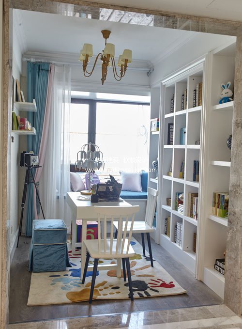 在家庭室里孩子們在這里寫字畫畫,父母一起陪伴孩子做手工閱讀圖書,陪伴他們的成長。書柜里擺放男主人的收藏和兒童書籍,還有家庭溫馨的旅游照片和孩子們的手工,讓人感受到家的溫馨。