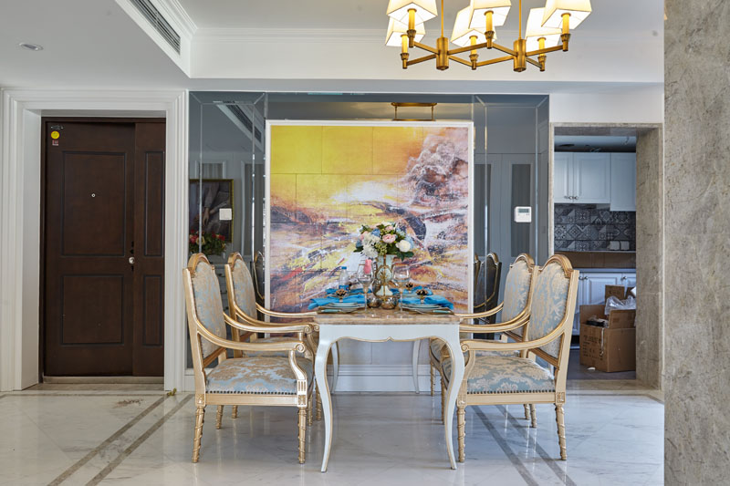 告別城市喧囂,剛從國外出差回來女主人就飛似的回到千般思念的家,脫下高跟鞋換上舒適優(yōu)雅的絲綢刺繡家居拖鞋,玄關(guān)處是她精心挑選的白色描金玄關(guān)柜,墻上懸掛著一幅她在法國小畫廊里淘回來的精致掛畫,兩邊的壁燈與精致的水晶吊燈相互呼應(yīng)折射出七彩光芒,女主人將鑰匙放到小瓷盒里便向餐廳望去。