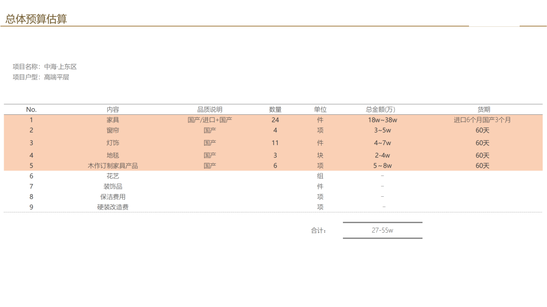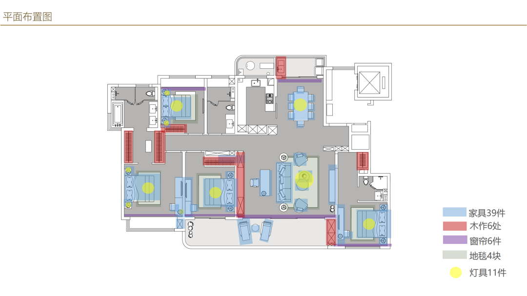 軟裝產品數量分析圖,軟裝區別于硬裝的是,軟裝是需要有產品落地的,我們能看出來,家具大致需要39件,木作大致6處,窗簾大致需要6處,地毯大概需要4塊,燈具大致在11件。