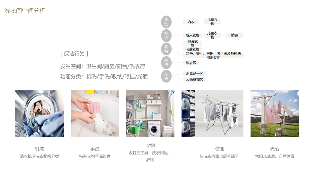 此區域為 洗衣房 ,是集機洗、手洗、晾曬和收納的區域,可以再添加一些設備,洗衣、熨燙、收納一條龍,并且設置單獨的操作臺,洗衣房不單只是洗衣的地方,也可以在這里縫補衣服,或者進行其他需要用水的活動。